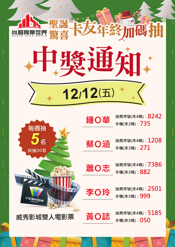 中獎公告-聖誕驚喜 卡友年終加碼抽-第三週