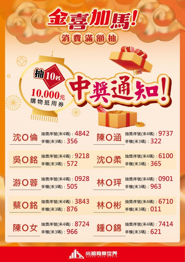 中獎公告-金喜加馬!消費滿額抽