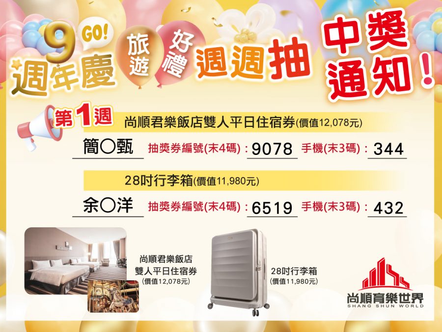 中獎公告-9週年慶GO!旅遊好禮週週抽-第一週